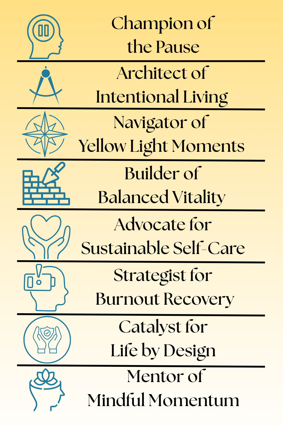 - Specializes in burnout prevention, intentional living, and sustainable self-care